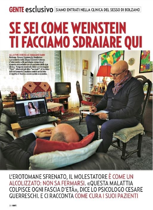 Articolo sulla rivista “Gente”: Se sei come Weinstein ti facciamo sdraiare qui al seguente link, l’articolo scaricabile in pdf: Articolo Gente siipac2024-02-14T11:30:26+01:00 Share This Story, Choose Your Platform! FacebookTwitterRedditLinkedInTumblrPinterestVkEmail Post correlati GIOCATI DAI VIDEOGIOCHI: la dipendenza da videogiochi Giugno 12th, 2023 LA GABBIA A LUCI ROSSE: la droga del porno e come colpisce il fruitore Giugno 2nd, 2023 UMANA DEFICIENZA e DEFICIENZA ARTIFICIALE: le AI come nuova intelligenza Maggio 28th, 2023 LA PAURA SI FA TASCABILE: la nomofobia e perchè tutti dovremmo temerla Maggio 25th, 2023 ZUCKENBERG COME PIGMALIONE: come i social influiscono sui canoni di bellezza Maggio 22nd, 2023 LA PIOVRA DEI LIKE “I social fanno male e Facebook lo sa” Maggio 19th, 2023 IL PROIBIZIONISMO Aprile 6th, 2023 LA TERAPIA DEL PERDONO Marzo 21st, 2023 Sessualità e Covid Agosto 3rd, 2021 Riflessioni ai tempi del Coronavirus Marzo 18th, 2020 Decreto Dignità – Comunicato Stampa D.G.A. Luglio 12th, 2018 QUANDO IL SESSO DIVENTA UN PROBLEMA: L’ANORESSIA SESSUALE Aprile 12th, 2018 La cultura del gioco, il gioco come cultura Dicembre 11th, 2017 2° tavolo nazionale sul gioco d’azzardo Novembre 30th, 2017 Molestie, la dipendenza da sesso e le terapie Novembre 17th, 2017 “Alto Adige” Sabato 21 Ottobre 2017 Ottobre 21st, 2017